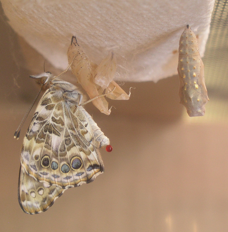 This butterfly is from the chrysalis above that is semi-transparent already (on the left in the first photo above, and on the right in the second photo above). The second photo below shows it releasing the red fluid after it emerged: